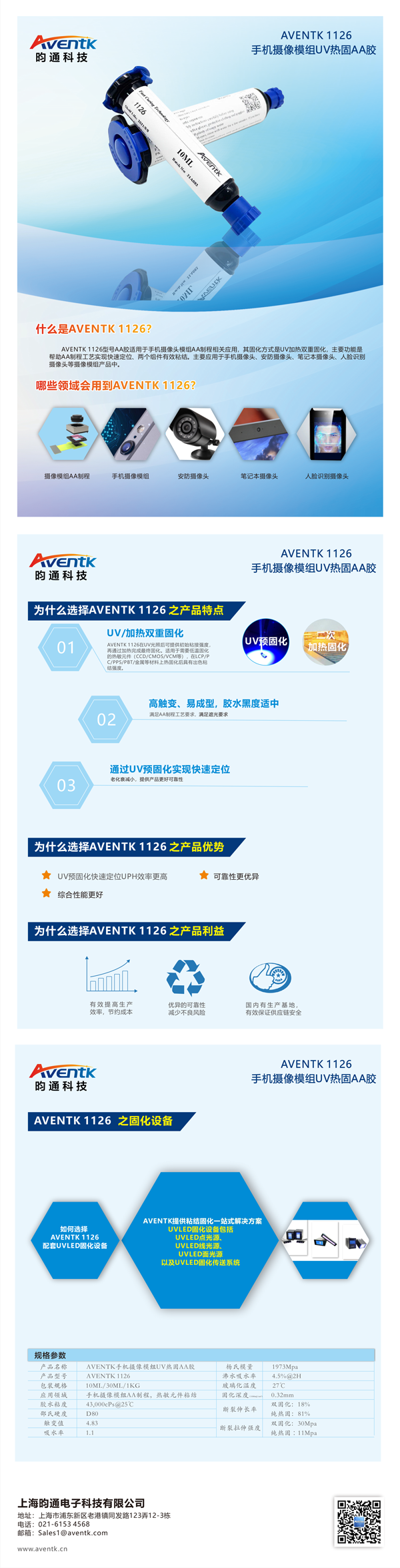 AVENTK 1126K10系列UV熱固黑膠是專(zhuān)為手機攝像模組AA制程所設計的AA膠,適用于需要低溫固化的熱敏元件(CCD/CMOS/VCM等),UV光照射后可提供初始粘接強度,再通過(guò)加熱完成最終固化。