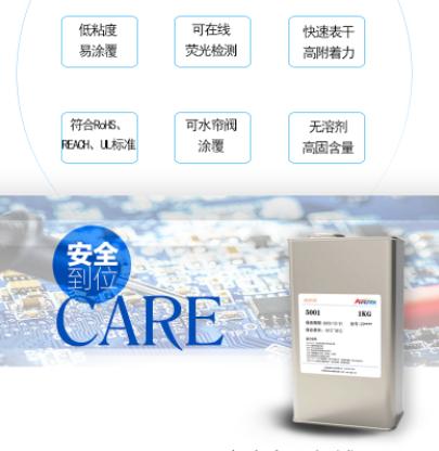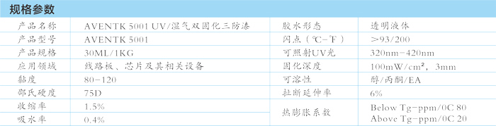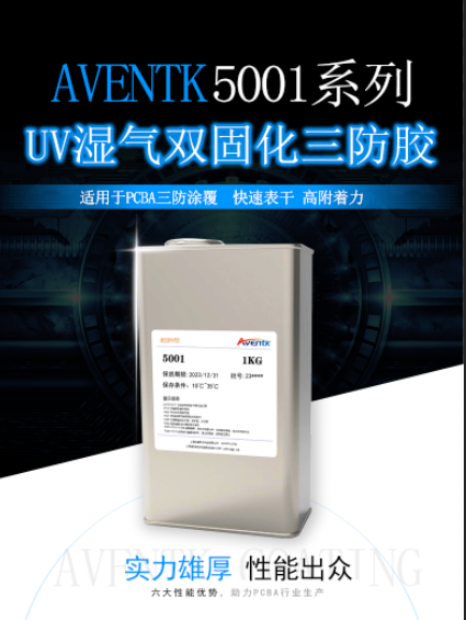 AVENTK  5001系列UV濕氣雙固化三防膠專(zhuān)用于PCBA三防涂覆,可用于電路板保護,具有良好的耐高低溫性能,以及絕緣、防潮、防漏電、防震、防塵、防腐蝕、防老化等性能。