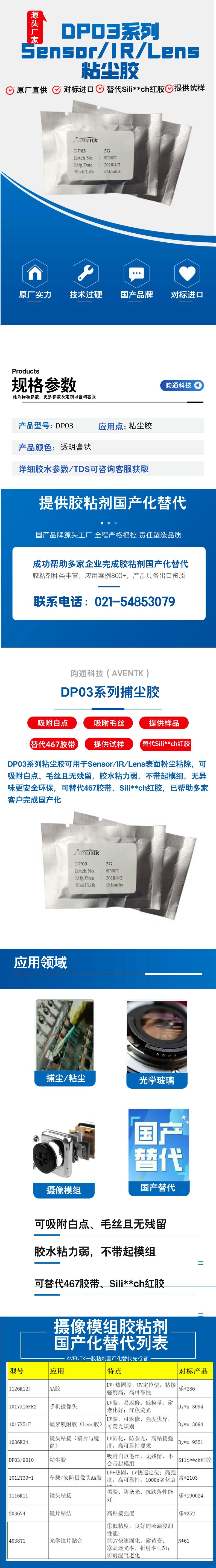 DP03系列粘塵膠可用于Sensor/IR/Lens表面粉塵粘除,可吸附白點(diǎn)、毛絲且無(wú)殘留,膠水粘力弱,不帶起模組,無(wú)異味更安全環(huán)保,可替代467膠帶、Sili**ch紅膠,已幫助多家客戶(hù)完成國產(chǎn)化