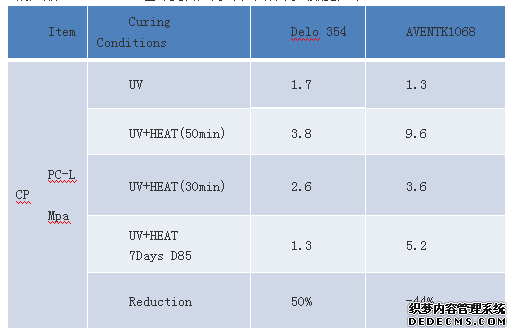 AVENTK針對此應用,研發(fā)生產(chǎn)了AVENTK 1068系列攝像模組uv膠水,深受客戶(hù)好評,具體測試數據如下: