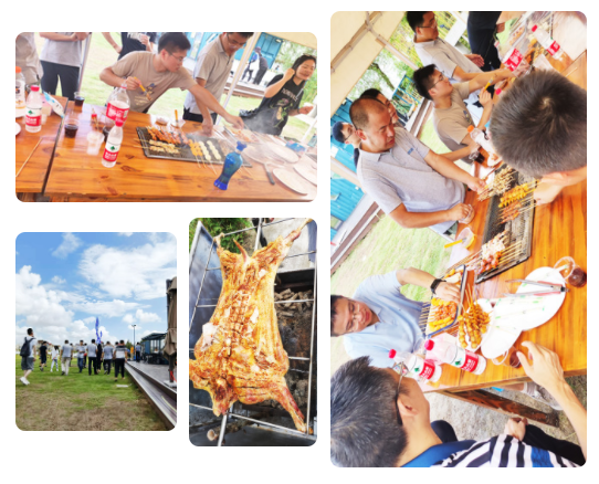 團建的最后一站,就是歡樂(lè )的BBQ時(shí)間—燒烤、K歌、桌游、烤全羊。藍天白云之下,在草坪之上,架起燒烤爐,選好喜歡的食物,煙火裊裊,香味飄飄。同事們有的聊天說(shuō)笑,有的縱情歌唱,有的專(zhuān)心燒烤,愉快且自在。燒烤活動(dòng)進(jìn)行到一半時(shí),開(kāi)始了大家期待的烤全羊。大家圍著(zhù)烤爐分享著(zhù)香噴噴的烤羊和羊雜湯,談天說(shuō)地,好不愉快。